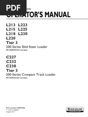 New holland 200 l213, l215, l218, l220, l223, l225, l230 skid steer service manual, hydraulic, pneumatic, electrical, electronic equipments. L213 l223 l215 l225 l218 l230 l220 tier 3. All repair and maintenance work listed in this manual must be carried out only by qualified dealership personnel, strictly complying with the instructions given . Operator's manual part number 48065346 1st edition english august 2017. Construction machines manuals for new holland loaders, excavators, engines, dozers and other equipment.